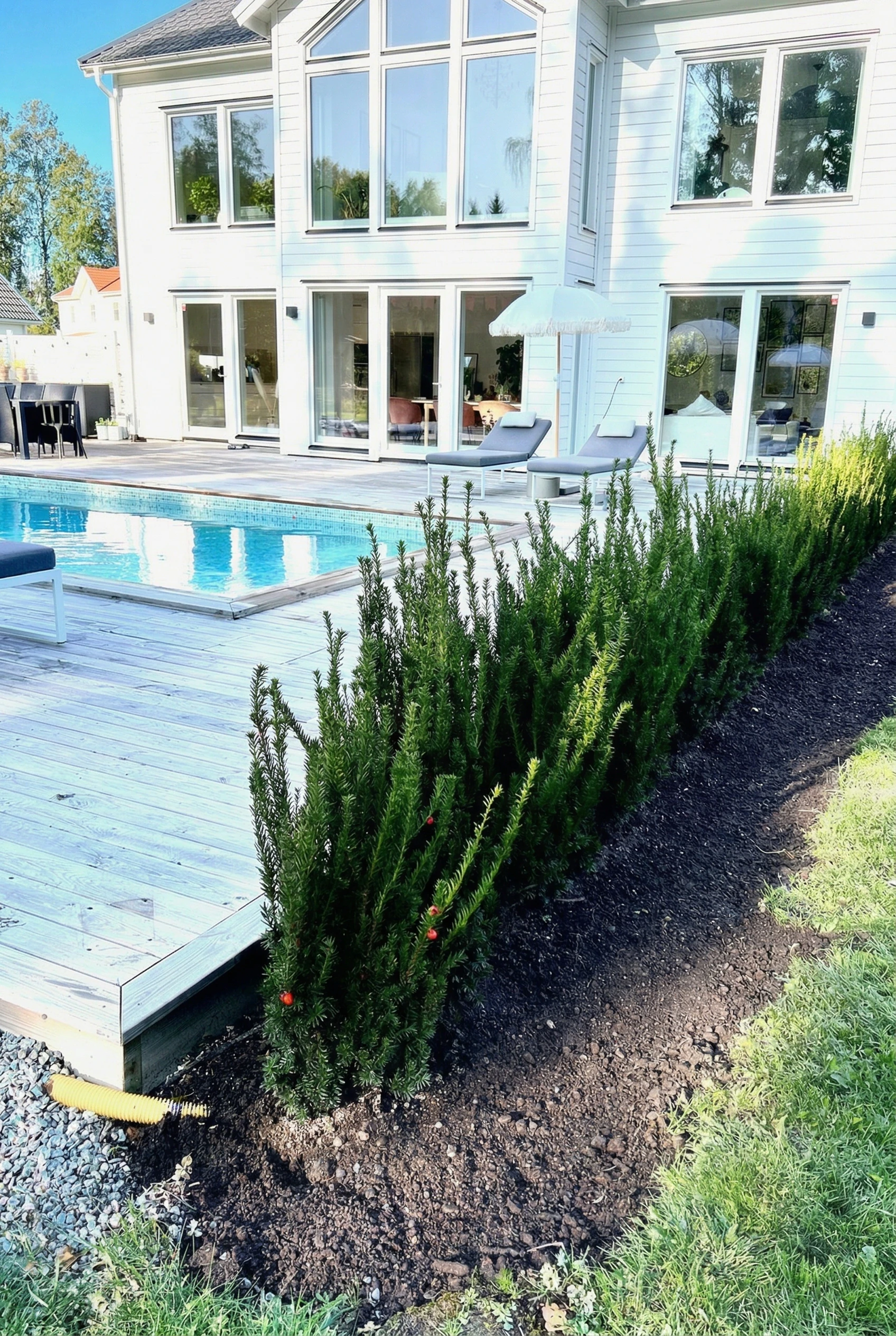 Mørkegrønne nåle, der bevarer deres farve året rundt. Samme dybe modstandsdygtighed som taks — men med en smal, søjleformet vækst, der fylder mindre uden at gå på kompromis med tætheden.